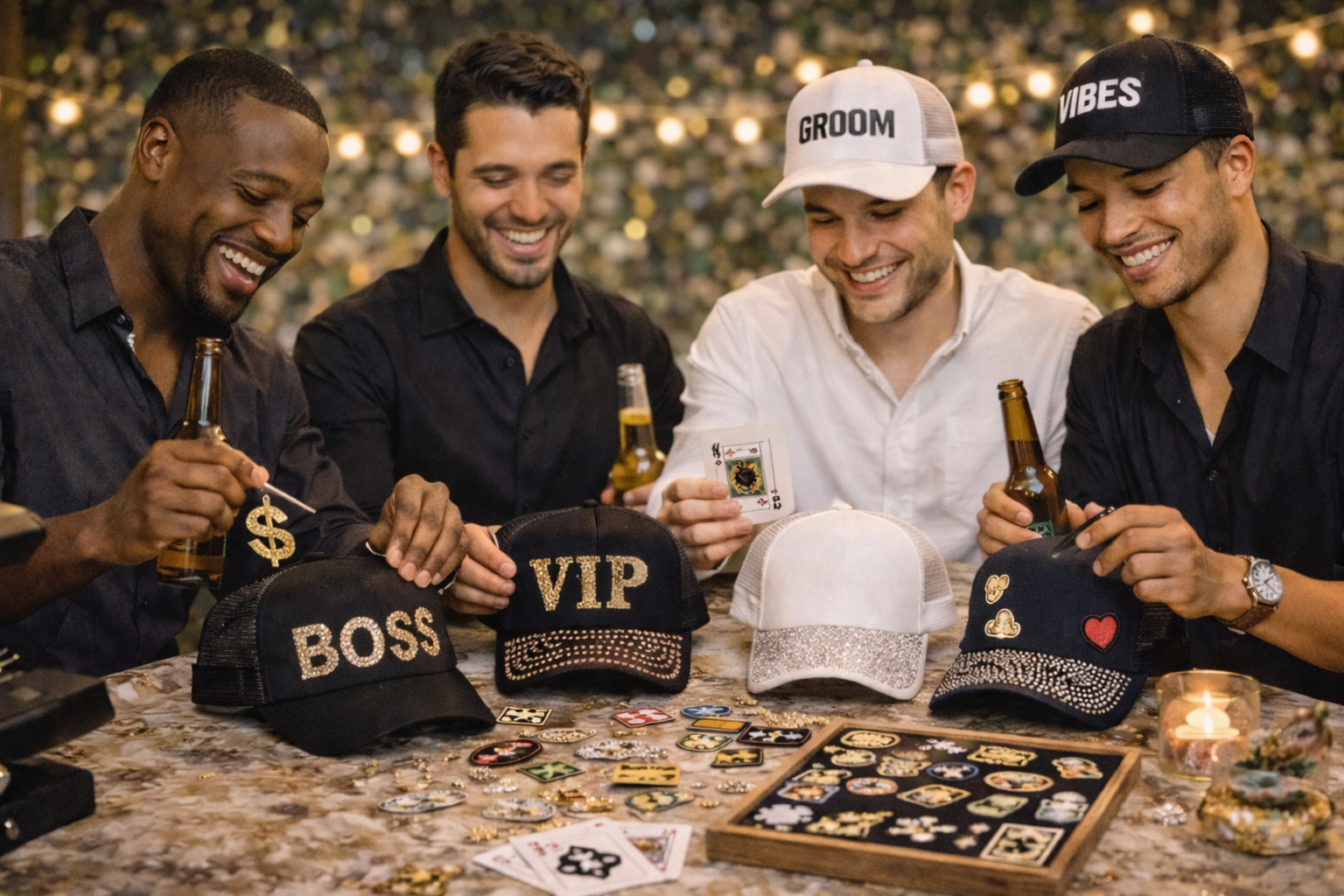 A trucker hat party is an event where participants get to create personalized trucker hats using patches, embroidery, vinyl, puff designs, charms, chains, rhinestones, and other embellishments. A host—often called a Hat Boss—provides all materials, tools, and creative guidance while guests design their own customized hats from scratch.